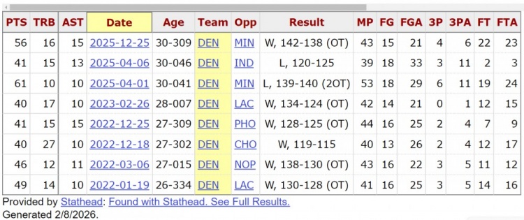 约基奇生涯至今8次40+三双,其中包括一次56分16篮板15助攻,一次61分10篮板10助攻。