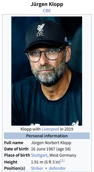 然而在两人的合照里,克洛普并没有比克劳奇矮太多。公开的百科数据显示,克洛普的身高也达到了1米91。